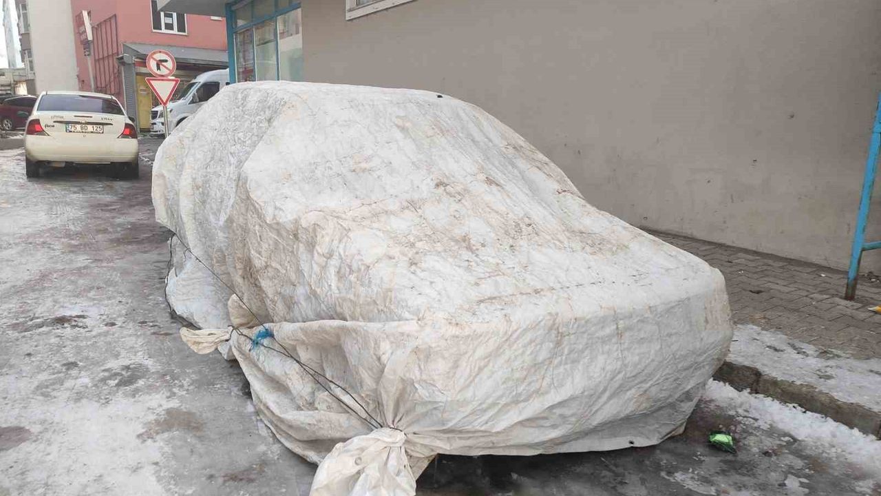 Ardahan’da araçlarının soğuk havalardan etkilenmesini istemeyen bazı vatandaşlar halı, naylon, karton ve battaniye ile koruma tedbiri almaya başladı.