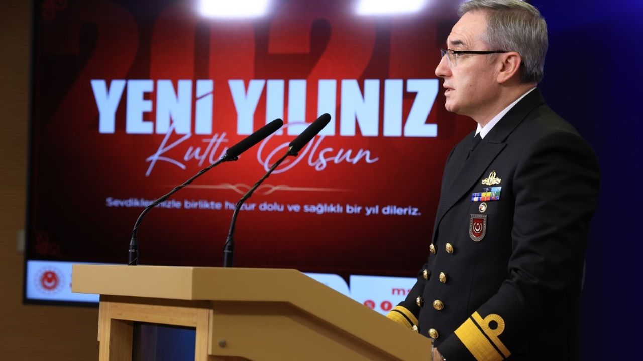 “Cumhurbaşkanımızın liderliğinde güçlü ve tam bağımsız bir savunma sanayi hedefi doğrultusunda geliştirilen yerli ve millî savunma sanayi ürünlerimizle Silahlı Kuvvetlerimiz her geçen gün daha da güçlenmekte ve caydırıcılığını artırmaktadır. Bu kapsamda Kara Kuvvetleri Komutanlığımızca muhtelif miktarda; yeni Nesil Fırtına obüsünün, NEFER Kuleli Zırhlı Muharebe aracının ve MİLKED Elektronik Destek Sistemi’nin muayene ve kabul faaliyetleri tamamlanmıştır. Mavi Vatanımız ve çevre denizlerin yanı sıra, ilgi alanımız olan tüm deniz ve okyanuslarda şanlı bayrağımızı dalgalandıran donanmamızın yeteneklerini küresel ölçekte genişleterek daha modern, daha etkin ve daha güçlü hâle getirilmesi amacıyla aynı anda 31 geminin inşası ülkemizin tersanelerinde başarıyla devam etmektedir. Bu çerçevede “Millî Denizaltı”mızın (MİLDEN) ilk kaynağı Gölcük Tersanesi Komutanlığımızda, “TF-2000 Hava Savunma Harbi Muhribi” ve “Millî Uçak Gemisi”nin ilk sac kesimleri ise İstanbul Tersanesi Komutanlığımızda yapılarak inşalarına başlanmıştır.” Personel ve askerî öğrenci temin faaliyetlerinin planlandığı şekilde devam ettiğini vurgulayan Tuğamiral Aktürk, “Millî Savunma Bakanlığı, Genelkurmay Başkanlığı, Kuvvet Komutanlıkları ve Millî Savunma Üniversitesine personel alımı kapsamında 20 Aralık’ta başlayan “Memur Temini” başvuruları 20 Ocak’a, Bugün 2 Ocak başlayan Millî Savunma Üniversitesi Askerî Öğrenci Aday Belirleme Sınavı başvuruları 27 Ocak’a kadar yapılabilecektir” diye konuştu.