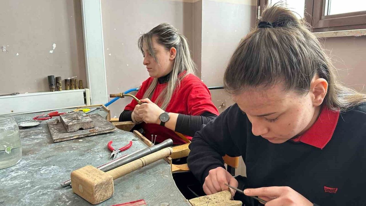 Kayseri’de Ahi Evran Mesleki ve Teknik Anadolu Lisesi Kuyumculuk Teknolojisi bölümünde okuyan kız öğrenciler, ilgi duydukları takıları kendileri şekillendirerek kuyumculuk mesleğine ilerliyor.
