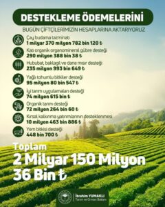 Tarım ve Orman Bakanı İbrahim Yumaklı sosyal medya hesabı üzerinden yaptığı paylaşımla 2 milyar 150 milyon 36 bin TL tarımsal destekleme ödemesinin çiftçilerin hesaplarına aktarılacağını belirtti. Bakan Yumaklı paylaşımında; “2 milyar 150 milyon 36 bin TL tarımsal destekleme ödemesini bugün çiftçilerimizin hesaplarına aktarıyoruz. Hayırlı ve bereketli olsun”ifadelerini kullandı.