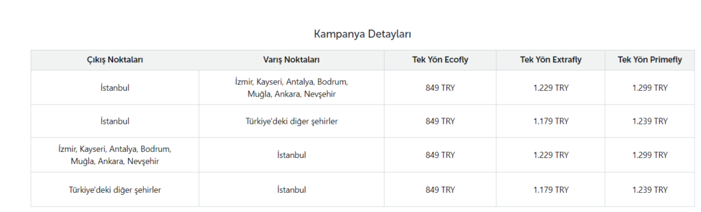 - Kampanya kapsamında sunulan ExtraFly pakette ücretler; İzmir, Kayseri, Antalya, Bodrum, Dalaman, Ankara, Nevşehir hatlarında 1.229 TL, PrimeFly pakette 1.299 TL’dir.