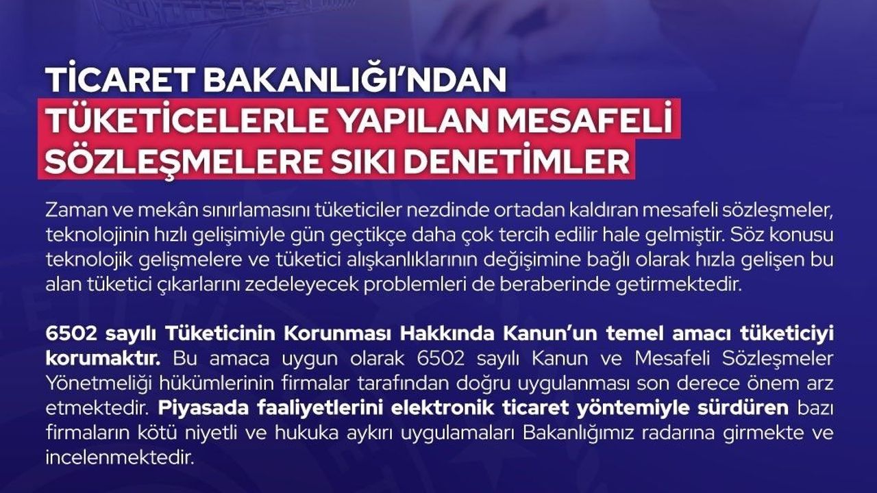 Bakanlıktan yapılan açıklamada, zaman ve mekan sınırlamasını tüketiciler nezdinde ortadan kaldıran mesafeli sözleşmelerin, teknolojinin hızlı gelişimi ve tüketici alışkanlıklarının değişimiyle daha çok tercih edilir hale geldiği ifade edildi. Söz konusu değişimlere bağlı olarak gelişen bu alanın, tüketici çıkarlarını zedeleyecek problemleri de beraberinde getirdiği aktarılan açıklamada, bu kapsamda, ilgili kanun ve Mesafeli Sözleşmeler Yönetmeliği hükümlerinin firmalarca doğru uygulanmasının önemli olduğuna işaret edildi.