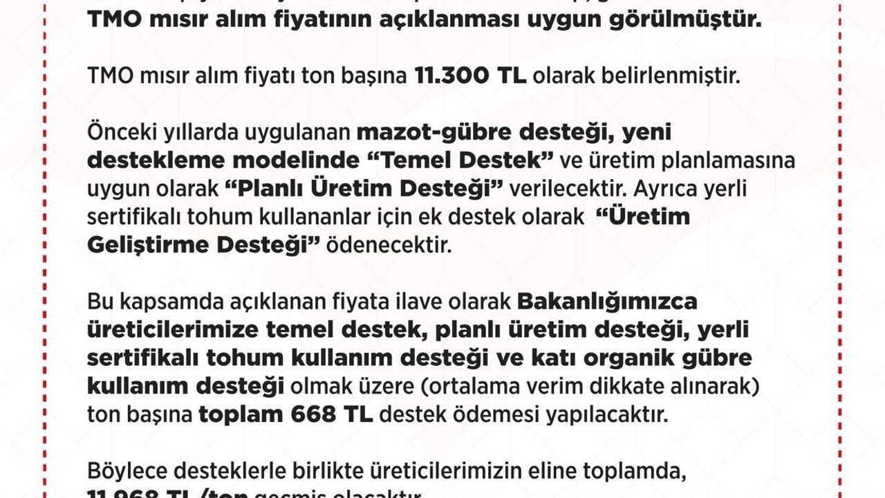 "Ülkemizde mısır hasadı Ağustos ayı başında Adana ve Hatay’da lokal olarak başlamıştır. Ülke genelinde hasat oranı yaklaşık yüzde 5 seviyelerindedir. Hasat ve piyasalar yakından takip edilmekte olup, gelinen noktada Toprak Mahsulleri Ofisi mısır alım fiyatının açıklanması uygun görülmüştür. Toprak Mahsulleri Ofisi mısır alım fiyatı ton başına 11 bin 300 lira olarak belirlenmiştir. Önceki yıllarda uygulanan mazot-gübre desteği, yeni destekleme modelinde ‘Temel Destek’ ve üretim planlamasına uygun olarak ‘Planlı Üretim Desteği’ verilecektir. Ayrıca yerli sertifikalı tohum kullananlar için ek destek olarak ‘Üretim Geliştirme Desteği’ ödenecektir. Bu kapsamda açıklanan fiyata ilave olarak Bakanlığımızca üreticilerimize temel destek, planlı üretim desteği, yerli sertifikalı tohum kullanım desteği ve katı organik gübre kullanım desteği olmak üzere (ortalama verim dikkate alınarak) ton başına toplam 668 lira destek ödemesi yapılacaktır. Böylece desteklerle birlikte üreticilerimizin eline toplamda, 11 bin 968 lira/ton geçmiş olacaktır. Toprak Mahsulleri Ofisi ürün bedeli ödemeleri, ürün teslimatını müteakip 30 gün içerisinde üreticilerin banka hesaplarına yapılacaktır. Tüm üreticilerimize hayırlı ve bereketli bir hasat sezonu diliyoruz."