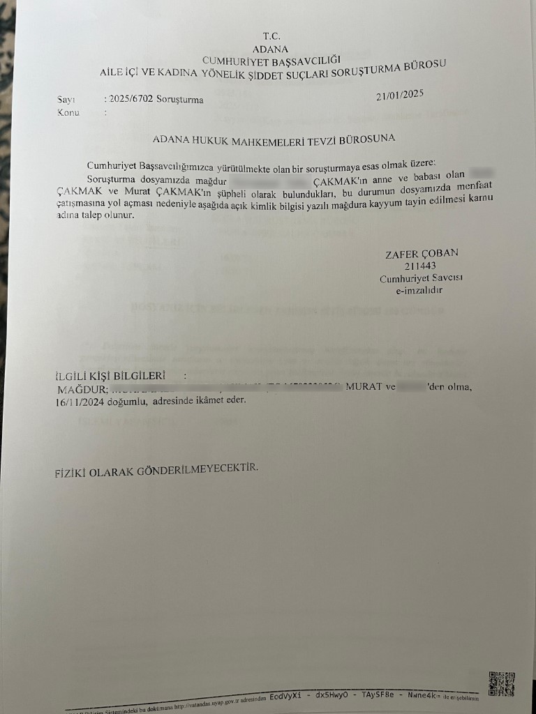 Ancak topuk kanı alınmayıp aşı yapılmadığı için özel hastane durumu çiftin ikamet ettiği mahallenin sağlık ocağına, onlarda Sağlık Bakanlığı’na bildirdi. Topuk kanı aldırmayan aile hakkında Sağlık Bakanlığı şikayetçi oldu ve Adana 6. Sulh Hukuk Mahkemesi’nde dava açıldı. Açılan davada mahkeme, ailenin ifadesine başvurdu. 2.5 aylık M.T. için kayyum atanmasına karar verdi. Aile, mahkeme sürecinde Murat Çakmak’ın kardeşi F.Ç.’yi evlatlarının vasisi olarak mahkemeye bildirdi. Davanın ilk duruşmasının önümüzdeki günlerde görülmesi bekleniyor.