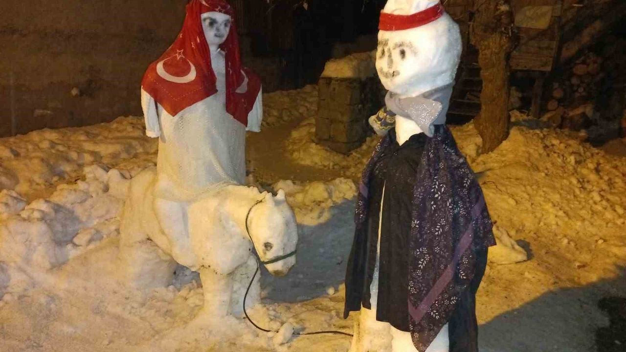 Erzurum’un Oltu ilçesinde Muhtar, İsmail Altaş, torununu mutlu etmek için kardan gelin, damat ve at heykeli yaptı.