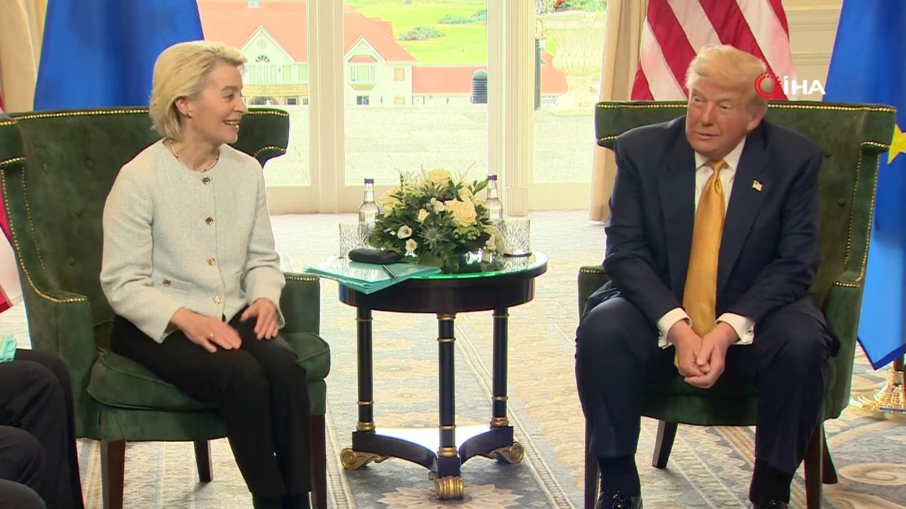 ABD Başkanı Donald Trump, İskoçya’nın batısındaki Turnberry’de bulunan golf tesisinde Avrupa Birliği (AB) Komisyonu Başkanı Ursula von der Leyen ile gerçekleştirdiği görüşmenin ardından basın mensuplarına açıklamalarda bulundu. Trump, 27 üyeli Avrupa Birliği’nden yapılan ithalatlara yüzde 15 oranında genel bir gümrük vergisi uygulanması konusunda anlaşma sağladıklarını duyurdu. Bu hamle, ABD ile AB arasında ticaret konusunda aylardır süren anlaşmazlığı sona erdirdi. "Çok büyük miktarda askeri teçhizat satın almayı da kabul ediyorlar"