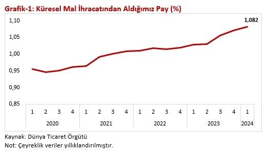 Küresel ihracattaki düşüşe rağmen ihracatımızdaki artışlar devam etmiştir. Bu kapsamda yıllıklandırılmış ihracatımızın küresel ihracattan aldığı paydaki artış eğilimi 2024 yılının ilk çeyreğinde de devam etmiş ve 2023 yılının ilk çeyreğine göre 0,05 puanlık artış ile yüzde 1,082 seviyesine yükselmiştir.