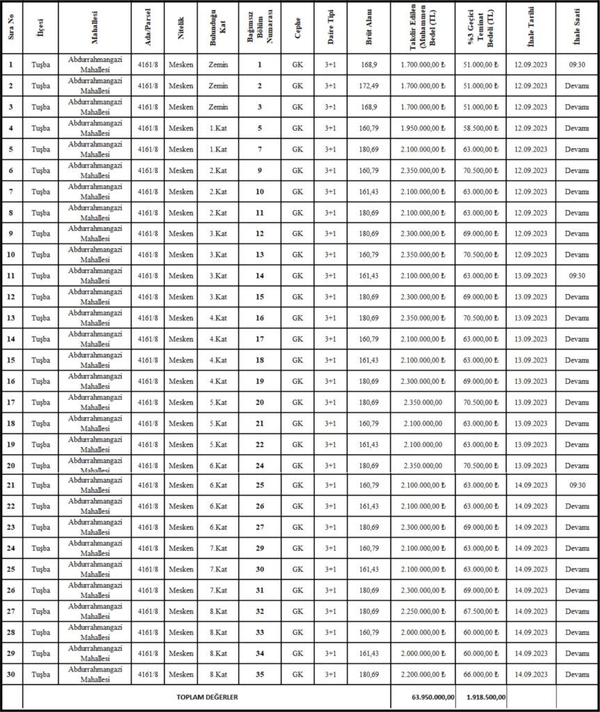 1. Mülkiyeti Belediyemize ait Tuşba ilçesi, Abdurrahman Gazi Mahallesi, imarın 4161 ada 8 parsel üzerindeki C-Blok’ta bulunan (30 Adet ) Daire bağımsız bölüm numarası, takdir edilen (muhammen) bedeli geçici teminatı yazılı taşınmazlar, 2886 sayılı kanununun 35/a. maddesi gereğince Kapalı Zarf usulü ile satış bedeli, ihale karar pulu, sözleşme karar pulu, ilan giderleri ve diğer giderleri peşin ödenmesi şartıyla peşin perakende (tek tek) mülkiyet satışı yapılacaktır. İhale 12-13-14/09/2023 tarihleri arasında saat :09:30 da başlamak üzere Erciş yolu Caddesi No:35A daki Belediye Hizmet binasında bulunan ENCÜMEN salonunda toplanacak Belediye ENCÜMENİ’nce yapılacak.