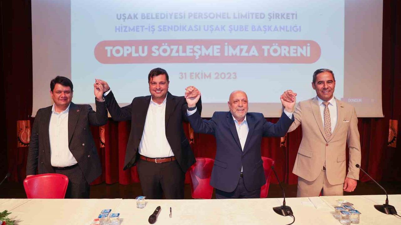Uşak Belediyesi Personel Ltd. Şti. bünyesinde hizmet veren 1820 personeli kapsayan,Uşak Belediyesi ile Hizmet- İş Sendikası arasında imzalanan toplu iş sözleşmesi ile en düşük maaş 2024 Ocak ayı itibariyle mevcut asgari ücretin yaklaşık 2 katına ulaşacak.Yılbaşı itibariyle geçerli olacak ve 32 ayı kapsayacak sözleşme ile, ilk 6 aylık dilimde %35 + %15’lik zam, diğer 6 aylık dilimlerde ise %12,5 + enflasyon oranında zam yapılacak.