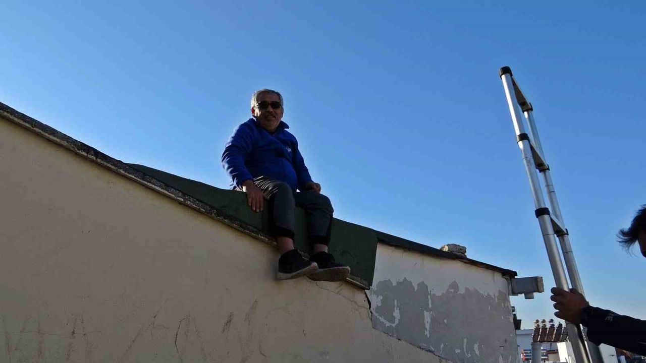 Gazetecilerin sorularını yanıtlayan Çalıcı, “Uyduda parazit vardı, onu alayım dedim. Çıktım inemedim. Arkamı dönüyorum düşecek gibi oluyorum. En iyisi 112’yi çağırayım dedim. Yüksekliği 2-2,5 metre var. Buradan değil ama oradan gözüne yüksek görünüyor. Atlasam bacağım kırılır diye düşündüm. Hanımın haberi yok. Hatunu aradım bir de 112’yi aradım. Halat olsa inerdim ama bir daha tek çıkmam. Allah razı olsun itfaiyemizden” dedi.