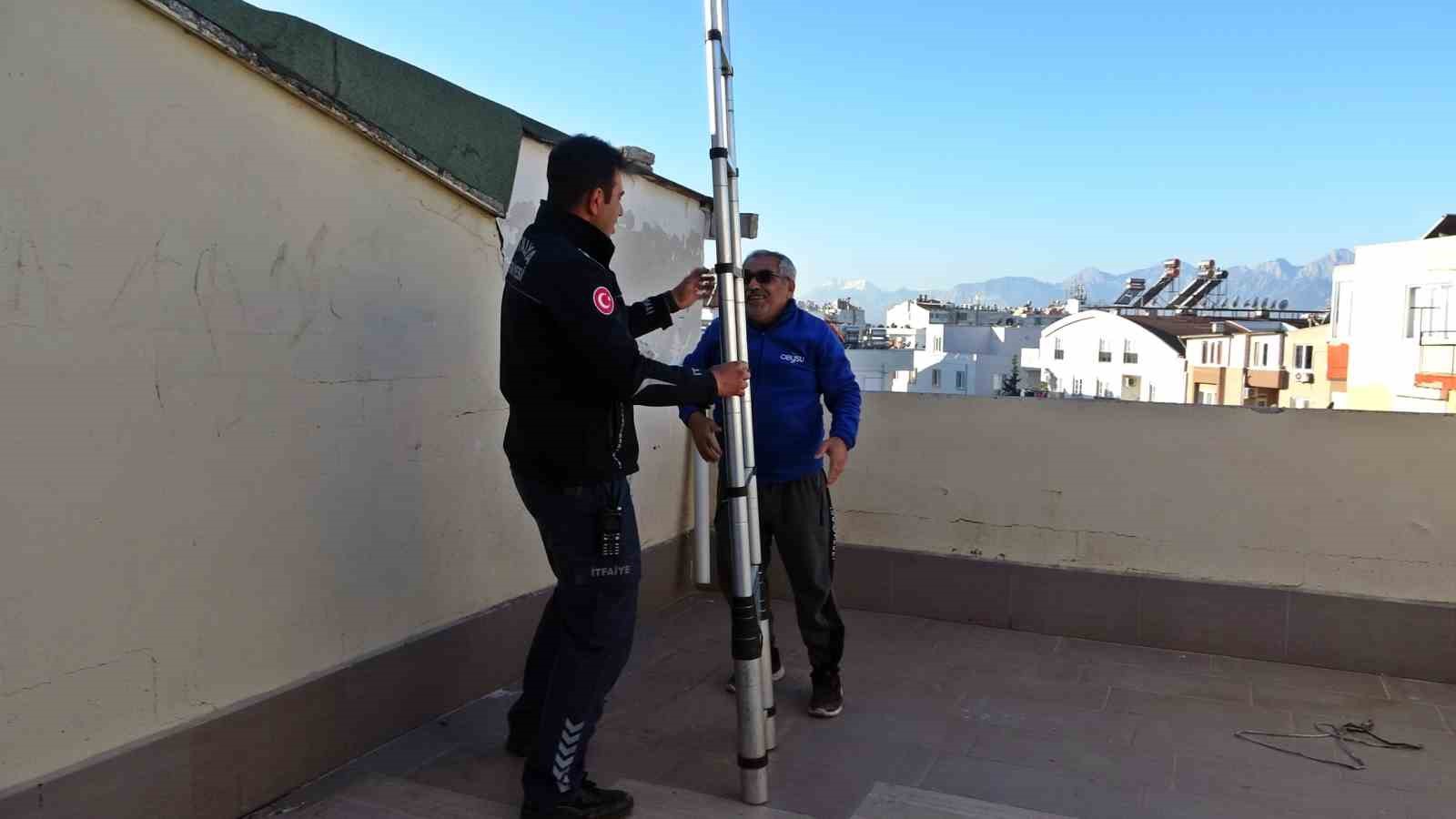 Antalya’da televizyon izlerken düşük sinyali düzeltmek için çatıdaki çanak anteninin yanına çıkan 58 yaşındaki adam, 2 metre yükseklikte mahsur kaldı. İtfaiyenin kurduğu el merdiveniyle bulunduğu yerden kurtarılan adam, çıktığı yere bakarak “Oradan daha yüksek görünüyor” dedi. Sağ salim evine ulaşan Çalıcı, balkondan itfaiye ekiplerine ve gazetecilere el sallayarak teşekkür etti.