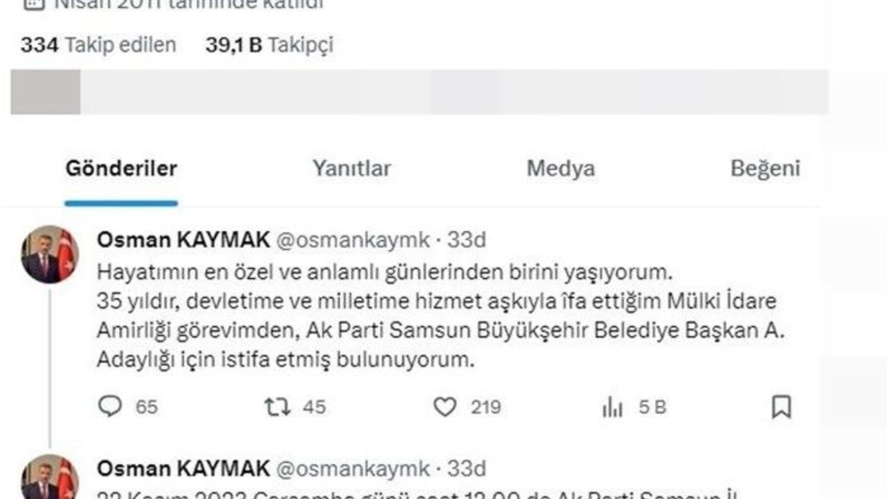 Kendisine ait sosyal medya hesabından açıklamada bulunan Kaymak, “Hayatımın en özel ve anlamlı günlerinden birini yaşıyorum. 35 yıldır devletime ve milletime hizmet aşkıyla îfa ettiğim mülki idare amirliği görevimden AK Parti Samsun Büyükşehir Belediye Başkan aday adaylığı için istifa etmiş bulunuyorum. 22 Kasım 2023 Çarşamba günü saat 12.00’de AK Parti Samsun İl Başkanlığı’na aday adaylığı başvurumu yaparak, basın açıklamasında bulunacağım. Allah, çıktığımız yolda bizleri mahcup etmesin” dedi.