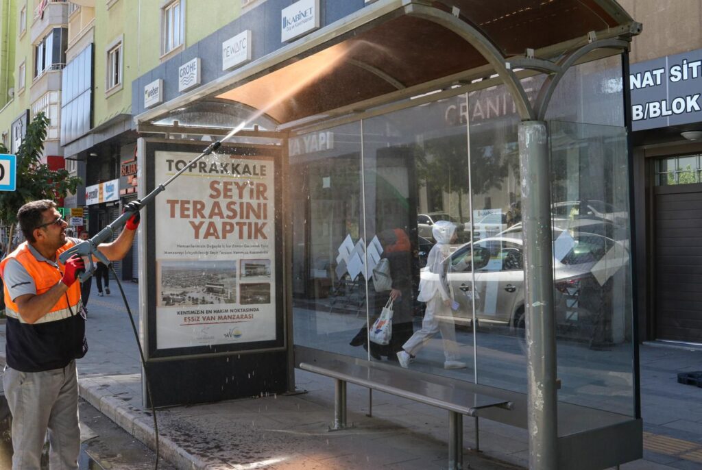 Özellikle vatandaşların yoğun olarak kullandığı kapalı ve açık duraklarda iç zeminler, cam yüzeyler, iç ve dış cephelerle birlikte titiz bir şekilde dezenfekte edilerek, kullanıma hazır hale getiriliyor.