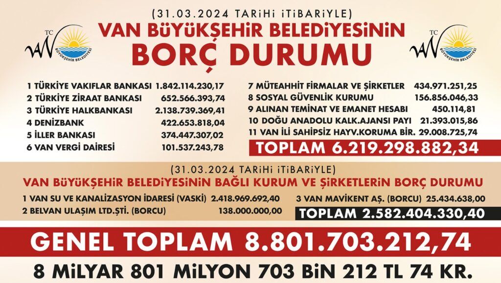 Van Büyükşehir Belediyesi’nin ilk meclis toplantısının ardından borç miktarı da açıklandı. Yayımlanan tabloya göre, belediyenin 8 buçuk milyar TL borcu olduğu ifade edildi.