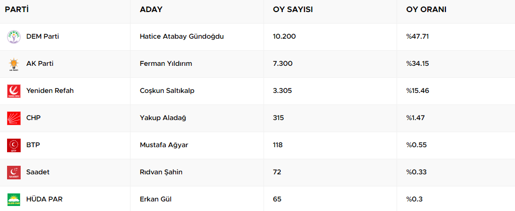 31 Mart yerel seçimlerinin ardından Van’ın Çaldıran ilçesinde kazanan parti DEM Parti oldu. Kesin olmayan sonuçlara göre Çaldıran ilçesinde Dem Parti adayı Hatice Atabay Gündoğdu aldığı yüzde 47,72 oy oranıyla 10 bin 200 oy aldı. AK Parti Belediye Başkan Adayı Ferman Yıldırım ise yüzde 34,15 oy oranıyla 7 bin 300 oy aldı. Yeniden Refah Partisi adayı Coşkun Saltıkalp de yüzde 15.46 oy oranıyla 3 bin 305 oy aldı.