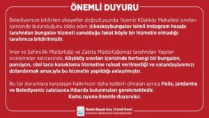 Belediye tarafından yapılan paylaşımda: “Belediyemize bildirilen şikayetler doğrultıusunda; İlçemiz Köşkköy mahallesi sınırları içerisinde bulunduğunu iddia eden @koskoybungalov isimli instagram hesabı tarafından bungalov hizmeti sunulduğu fakat böyle bir hizmetin olmadığı tarafımıza bildirilmiştir. İmar ve Şehircilik Müdürlüğü ve Zabıta Müdürlüğümüz tarafından yapılan incelemeler neticesinde, Köşkköy sınırları içerisinde herhangi bir bungalov, pansiyon, otel tarzı konaklama hizmetine ruhsat verilmediği ve vatandaşlarımızı dolandırmak amacıyla bu hizmetin yapıldığı anlaşılmıştır. Bu tür durumlarla karşılaşan halkımızın daha tedbirli olmaları ayrıca polis, jandarma ve belediyemiz zabıtasına ihbarda bulunmaları gerekmektedir. Kamuoyuna önemle duyurulur” ifadeleri kullanıldı.