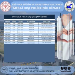 Sağlık Bilimleri Üniversitesi (SBÜ) Van Eğitim ve Araştırma Hastanesi, bugün mesai sonrası hizmet verecek poliklinikleri duyurdu. Hastaneden yapılan açıklamaya göre, mesai sonrası hizmet verecek olan poliklinikler ve uzmanlar şu şekilde sıralandı.