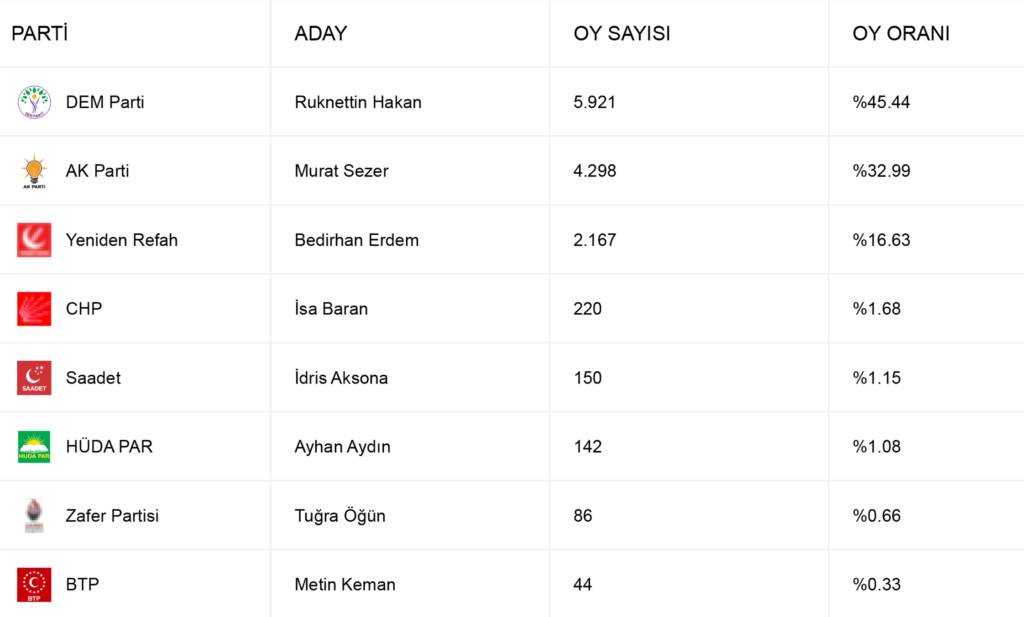 31 Mart yerel seçimlerinin ardından Van’ın Gevaş ilçesinde kazanan parti DEM Parti oldu. Kesin olmayan sonuçlara göre Gevaş ilçesinde Dem Parti adayı Ruknettin Hakan aldığı yüzde 45,45 oy oranıyla 5 bin 921 oy aldı. Ak Parti adayı Murat Sezer ise yüzde 32.99 oy oranıyla 4 bin 298 oy aldı. Yeniden Refah Partisi Belediye Başkan Adayı Bedirhan Erdem de yüzde 16,63 oy oranıyla 2 bin 167 oy aldı.