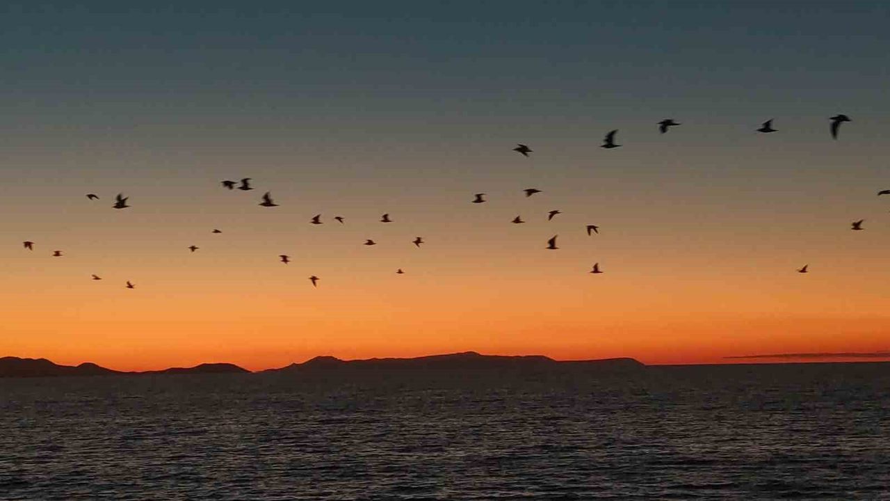 Van Gölü sahillerinde gündüz saatlerinde yiyecek arayarak karınlarını doyuran kuşlar, akşam saatlerinde farklı alanlara göç ederken kartpostallık görüntülerin ortaya çıkmasına neden oluyor.