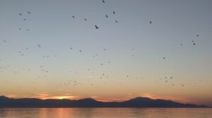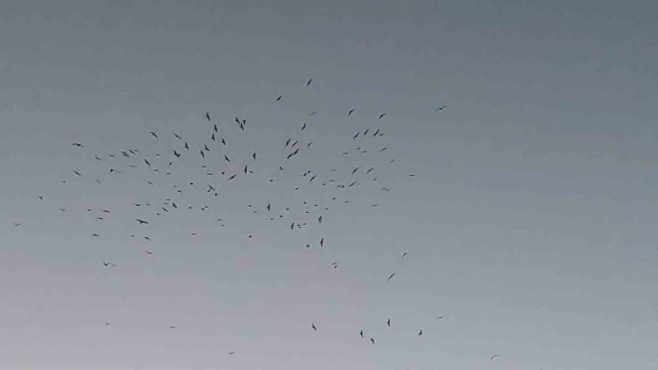 Güneşin göl yüzeyine yansıyan kızıl tonlarıyla birleşen bu eşsiz manzara, dans edercesine dönen kuşların hızlı ve ahenkli hareketleriyle gökyüzünde sürekli değişen dinamik şekiller oluşturmasına sahne oldu. Tek bir organizma gibi hareket eden kuş sürüsü, bazen bir girdabı andıran dairesel hareketler çizerken izleyenlere unutulmaz anlar yaşattı.