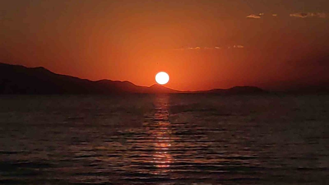 Akşam saatlerinde güneşin kızıl renklere bürünmesiyle gökyüzünün turuncudan kızıla uzanan renk cümbüşü, Van Gölü’nün sularına yansıyarak göl yüzeyinde adeta tablo gibi görüntüler ortaya çıkardı. Sahil kenarında gün batımını izleyen vatandaşlar, bu eşsiz manzarayı cep telefonlarıyla görüntüleyerek kaydetti.