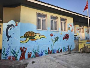 Okul yönetiminin talebi üzerine başlatılan çalışma kapsamında öğrenciler, sınıf koridorları, oyun alanları ve ortak kullanım noktalarını çocukların ilgisini çekecek şekilde yeniden tasarladı. Hayvan figürleri, alfabe karakterleri, doğa temalı çizimler ve temel eğitim unsurlarının yer aldığı resimlerle duvarlar, hem eğlenceli hem öğretici bir görünüme kavuşturuldu.