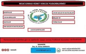 SBÜ Van Eğitim ve Araştırma Hastanesi vatandaşların randevu konusunda sıkıntı yaşamamaları amacıyla bazı polikliniklerde mesai sonrası hizmet veriyor. Hastane yönetimi bugün mesai sonrası hizmet verecek olan poliklinikleri paylaştı. Bugün mesai sonrası hizmet verecek olan poliklinikler sırasıyla şöyle; “Kardiyoloji, Çocuk Nörolojisi, Radyoloji, Ruh Sağlığı ve Hastalıkları, Çocuk Kardiyolojisi, Çocuk Sağlığı ve Hastalıkları, Nükleer Tıp, Perinatoloji, Çocuk Kardiyolojisi”
