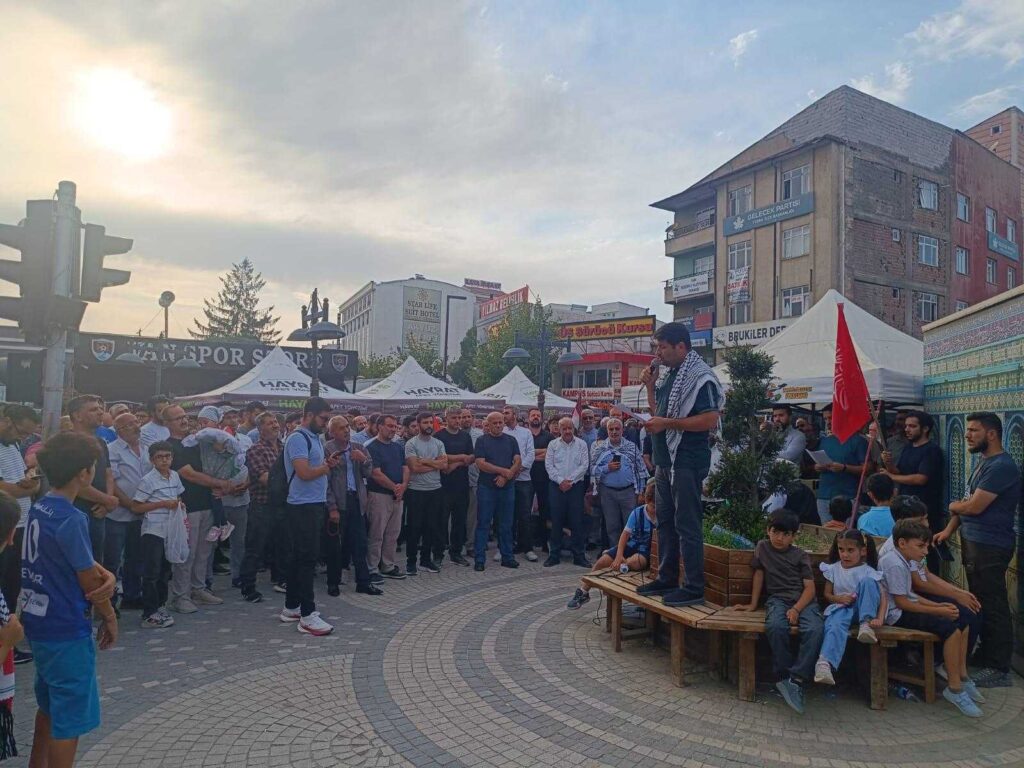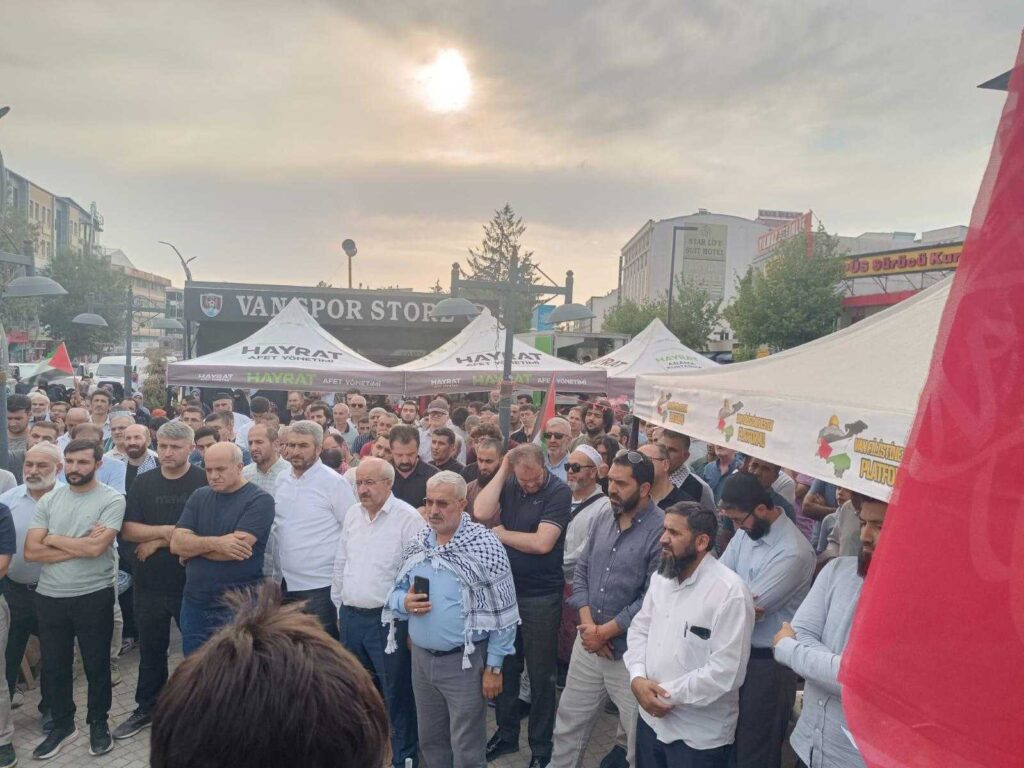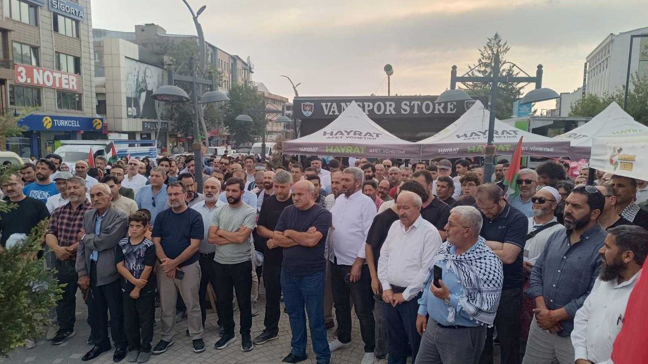 Van Filistin’e Destek Platformu öncülüğünde düzenlenen etkinlikte yüzlerce vatandaş, Filistin bayrakları ve dövizlerle İsrail’e tepki gösterdi, İslam ülkelerine çağrıda bulundu.