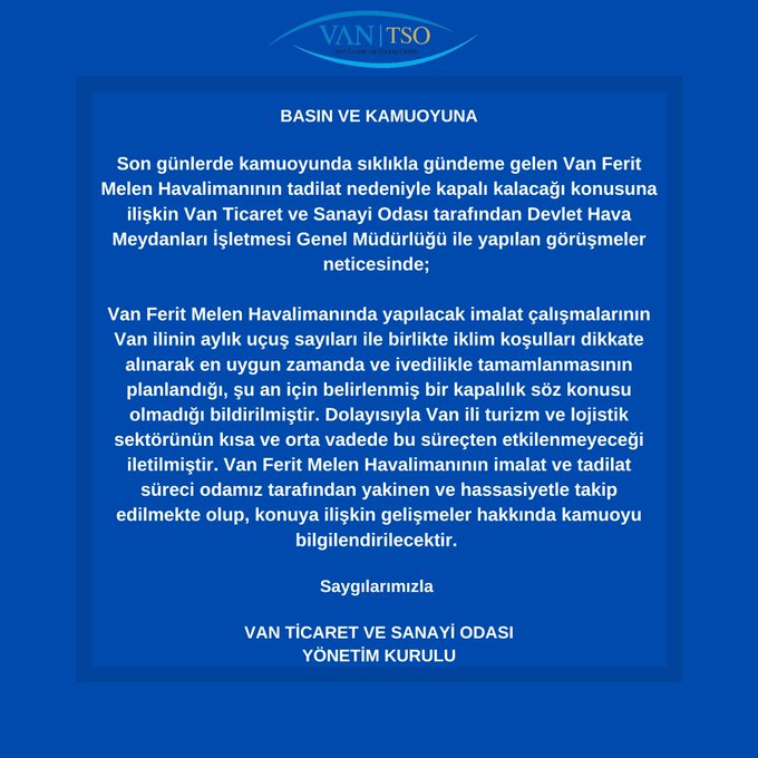 “Son günlerde kamuoyunda sıklıkla gündeme gelen Van Ferit Melen Havalimanının tadilat nedeniyle kapalı kalacağı konusuna ilişkin Van Ticaret ve Sanayi Odası tarafından Devlet Hava Meydanları İşletmesi Genel Müdürlüğü ile yapılan görüşmeler ve girişimler neticesinde; Van Ferit Melen Havalimanında yapılacak imalat çalışmalarının Van ilinin aylık uçuş sayıları ile birlikte iklim koşulları dikkate alınarak en uygun zamanda ve ivedilikle tamamlanmasının planlandığı, şu an için belirlenmiş bir kapalılık söz konusu olmadığı bildirilmiştir. Dolayısıyla Van ili turizm ve lojistik sektörünün kısa ve orta vadede bu süreçten etkilenmeyeceği iletilmiştir. Van Ferit Melen Havalimanının imalat ve tadilat süreci odamız tarafından yakinen ve hassasiyetle takip edilmekte olup, konuya ilişkin gelişmeler hakkında kamuoyu bilgilendirilecektir”