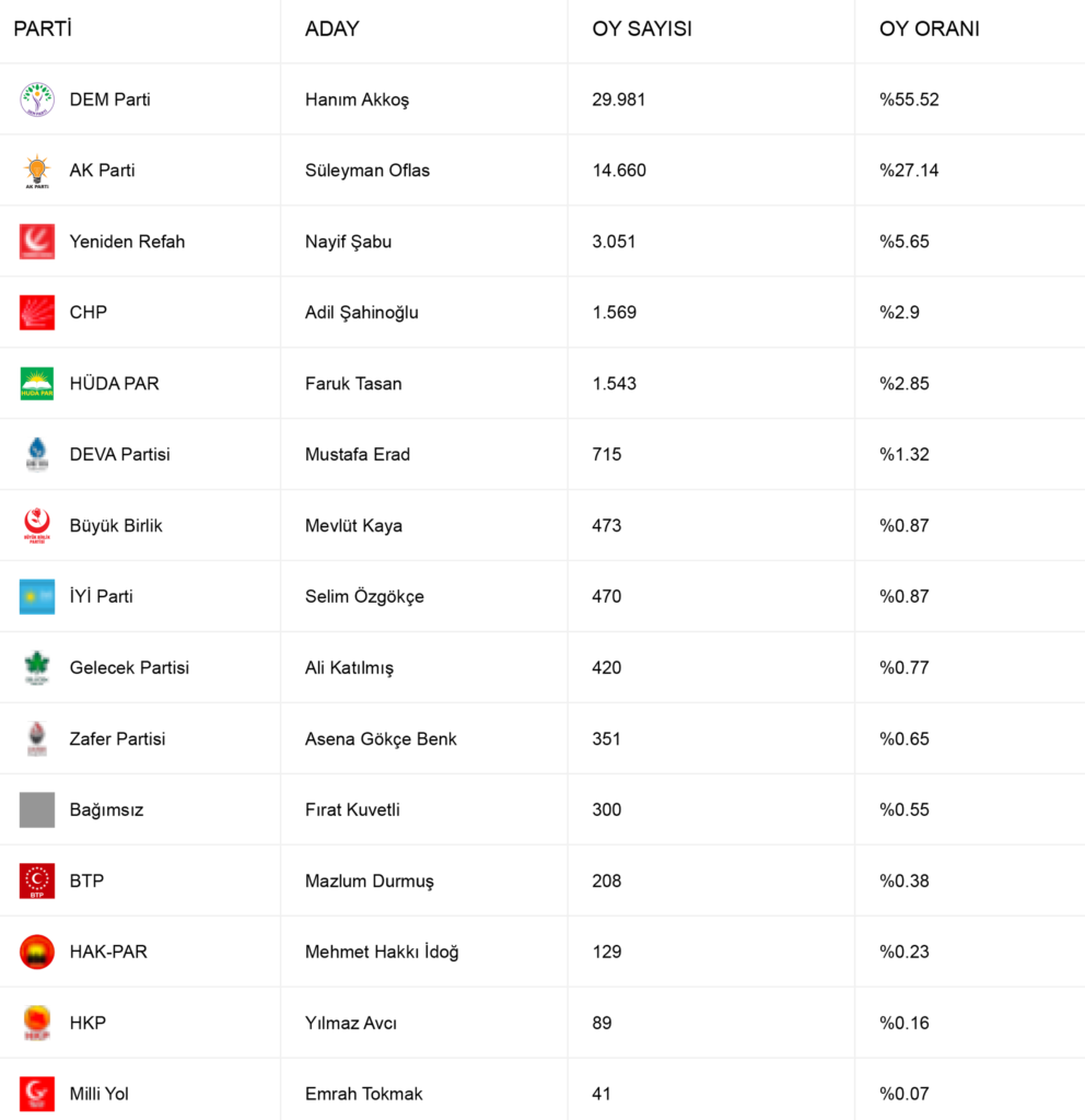 31 Mart yerel seçimlerinin ardından Van’ın Tuşba ilçesinde kazanan parti DEM Parti oldu. Kesin olmayan sonuçlara göre Tuşba İlçesinde Dem Parti adayı Hanım Akkoş aldığı yüzde 55,52 oy oranıyla 29 bin 981 oy aldı. Ak Parti adayı Süleyman Oflas ise yüzde 27.15 oy oranıyla 114 bin 660 oy aldı. Yeniden Refah Partisi Belediye Başkan Adayı Nayif Şabu da yüzde 5,65 oy oranıyla 3 bin 51 oy aldı.
