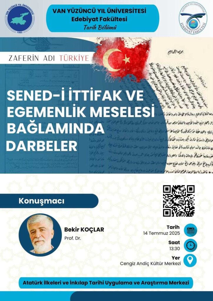 Van Yüzüncü Yıl Üniversitesi (Van YYÜ) Edebiyat Fakültesi Tarih Bölümü tarafından düzenlenen konferans kapsamında, Prof. Dr. Bekir Koçlar katılımcılarla buluşacak. “Sened-i İttifak ve Egemenlik Meselesi Bağlamında Darbeler” konulu etkinlik, 14 Temmuz 2025 Pazartesi günü saat 13:30’da Cengiz Andiç Kültür Merkezi’nde gerçekleştirilecek.