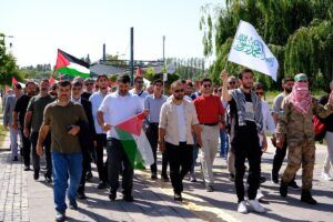 Edebiyat Fakültesi önünde bir araya gelen akademisyen ve öğrenciler, merkezi yemekhane binasına kadar yürüdü. Yürüyüşün ardından el ele tutuşan öğrenciler bedenleriyle ‘Gazze’ yazdı.