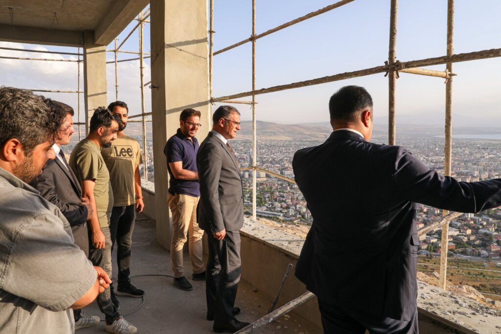 Toprakkale Seyir Terasında incelemelerde bulunan Van Valisi ve Belediye Başkan Vekili Dr. Ozan Balcı, Büyükşehir Belediyesi Genel Sekreteri Mehmet Fatih Çelikel’den bilgi aldı.