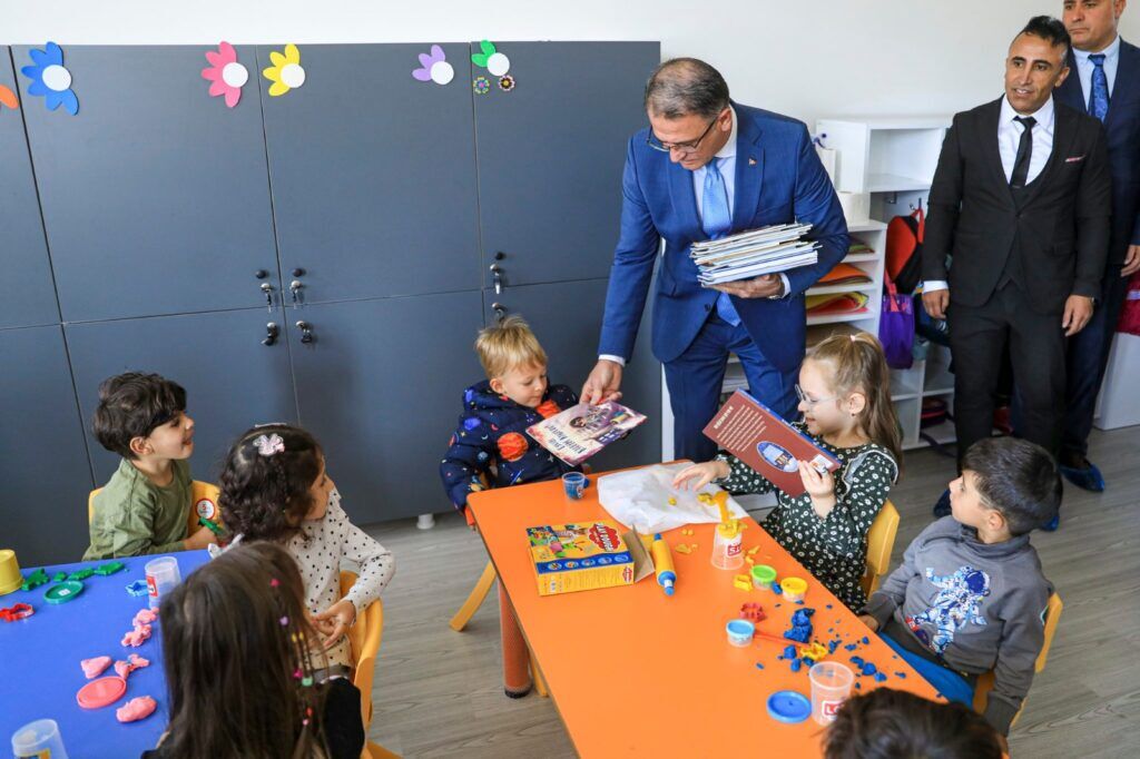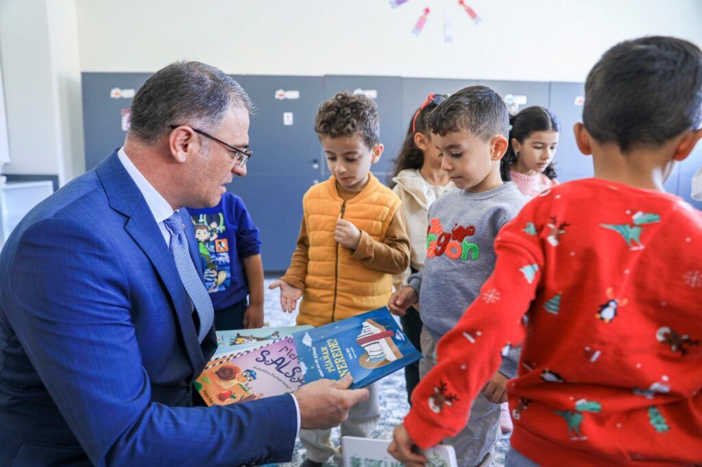 tarafından karşılanan Vali Balcı, oyun parkı, trafik eğitim parkı, sinema ve konferans salonu, yemekhane ile spor alanlarının bulunduğu anaokulunda sınıfları dolaşarak minik öğrencilere kitap hediye etti.