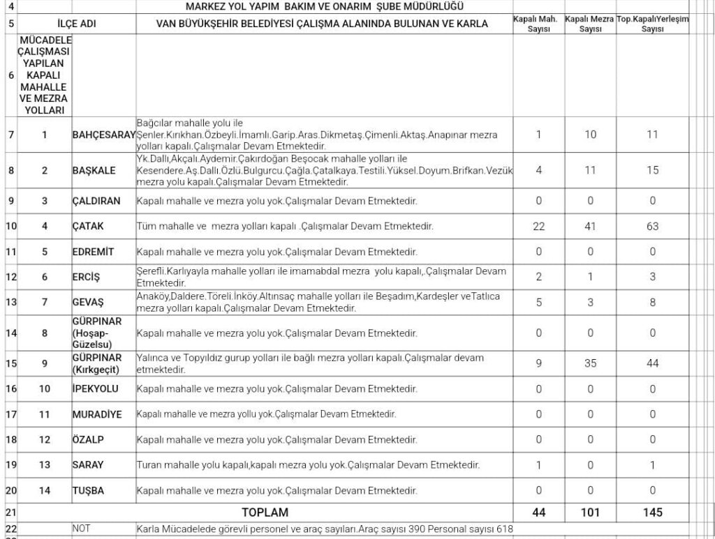 Van’da kar yağışı ve tipi hayatı olumsuz etkiledi. Kar yağı nedeniyle Bahçesaray’da 11, Başkale’de 15, Çatak’ta 63, Erciş’te 3, Gevaş’ta 8, Gürpınar’da 44 ve Saray ilçesinde 1 olmak üzere 145 yerleşim yolu ulaşıma kapandı.