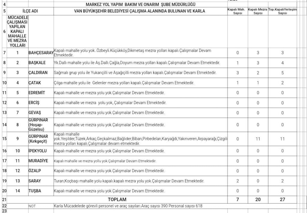 Van’da kar yağışı ve tipi hayatı olumsuz etkiledi. Kar yağı nedeniyle Bahçesaray’da 3, Başkale’de 4, Çaldıran’da 5, Çatak’ta 2, Gürpınar’da 11 ve Saray’da 2 olmak üzere 27 yerleşim yolu ulaşıma kapandı.