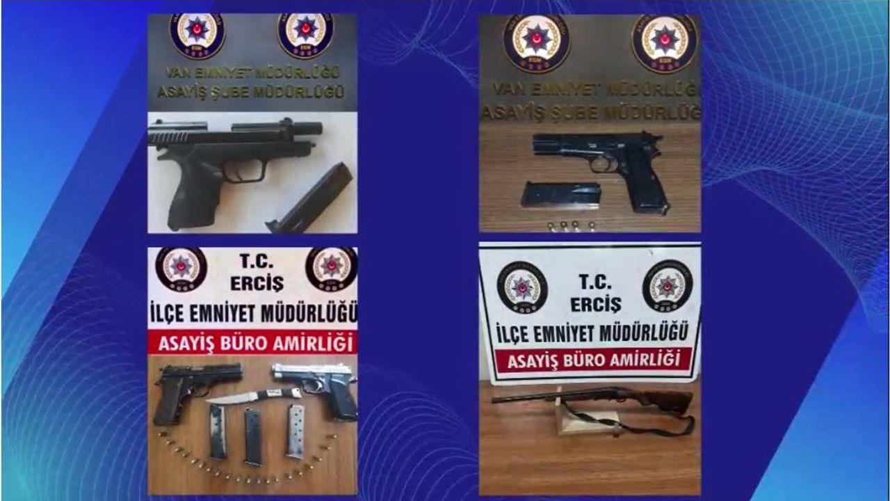 Van Emniyet Müdürlüğünden yapılan açıklamada, il genelinde kamu düzeninin sağlanması için suç ve suçlularla mücadele kapsamında Asayiş Şube Müdürlüğü ve İlçe Emniyet Müdürlüğü/Amirliği görevlilerince yürütülen çalışmaların devam ettiği belirtildi. Açıklamada, “Yapılan çalışmalar neticesinde 6136 ve 5729 Sayılı Kanun’a Muhalefet olaylarında; 5 adet ruhsatsız tabanca, 1 adet kuru sıkı tabanca, 1 adet tüfek, 36 adet fişek, 1 bıçak ele geçirilmiştir. Diğer suçlardan 1 adet motosiklet, 1 adet sahte plaka ve muhtelif malzemeler ele geçirilmiştir. İl Emniyet Müdürlüğümüz tarafından toplam 221 şahıs yakalanmış, 82 yıl 2 ay kesinleşmiş hapis cezası bulunan 37 şahıs adli makamlarca tutuklanmıştır” denildi.