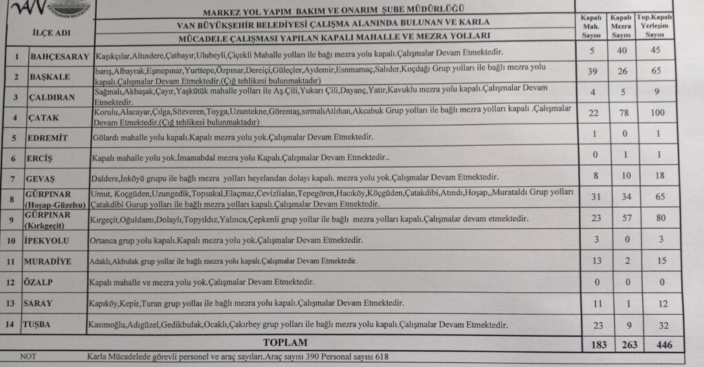 Van’da dün gece etkili olan kar yağışı ve tipi hayatı olumsuz etkiledi. Kar yağışı nedeniyle Bahçesaray’da 45, Başkale’de 65, Çaldıran’da 9, Çatak’ta 100, Edremit’te 1, Erciş’te 1, Gevaş’ta 18, Gürpınar’da 145, İpekyolu’nda 3, Muradiye’de 15, Saray’da 12 ve Tuşba ilçesinde 32 olmak üzere toplam 446 yerleşim yerinin yolu ulaşıma kapandı.