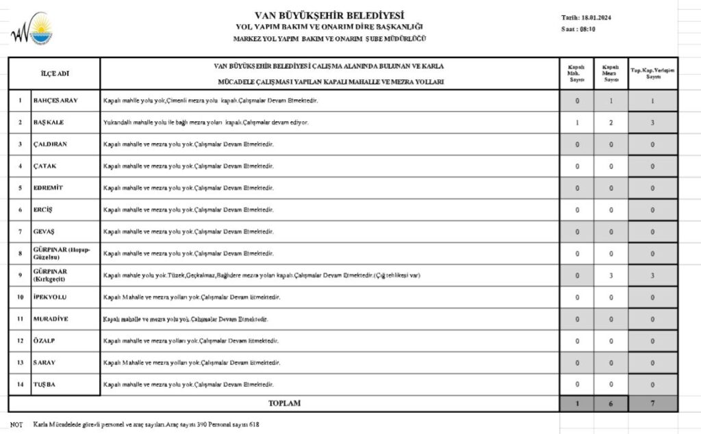Yağan kar nedeniyle Bahçesaray’da 1, Başkale’de 3 ve Gürpınar’da 3 olmak üzere toplam 7 yerleşim yerinin yolu ulaşıma kapandı.