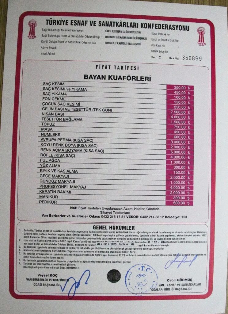 Van Berberler ve Kuaförler Odası, yılın başında Van Esnaf ve Sanatkârlar Odaları Birliği ile Türkiye Berberler, Kuaförler ve Güzellik Salonu İşletmecileri Federasyonu’na başvurarak yüzde 50 zam talebinde bulunmuştu. Üst kuruldan onay alan bu talep, bayram öncesinde yürürlüğe girerek yeni fiyat tarifesiyle duyuruldu.