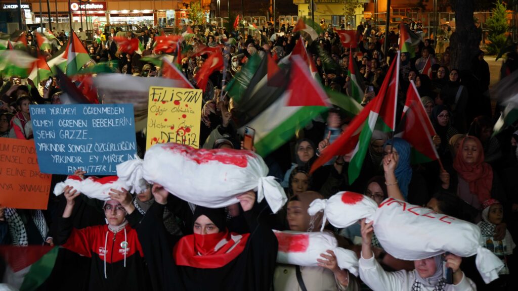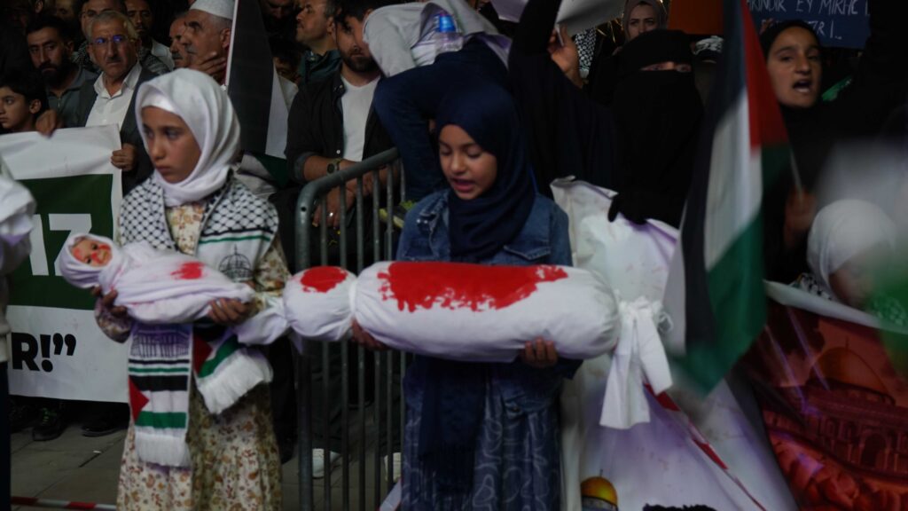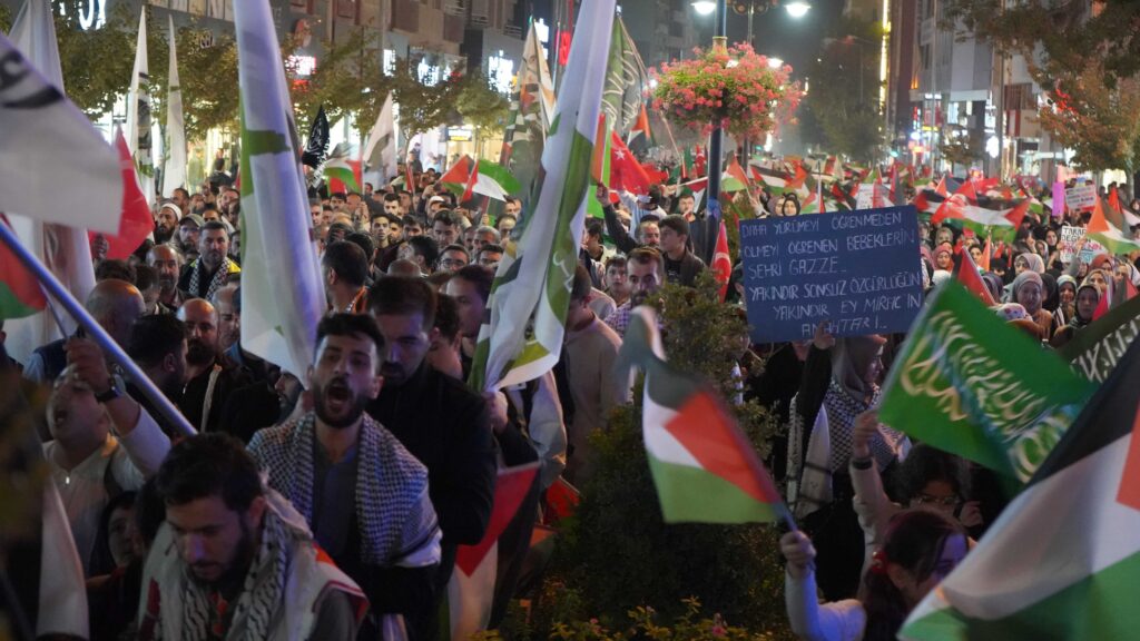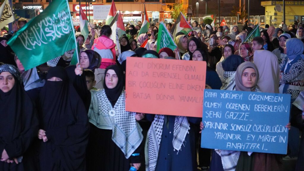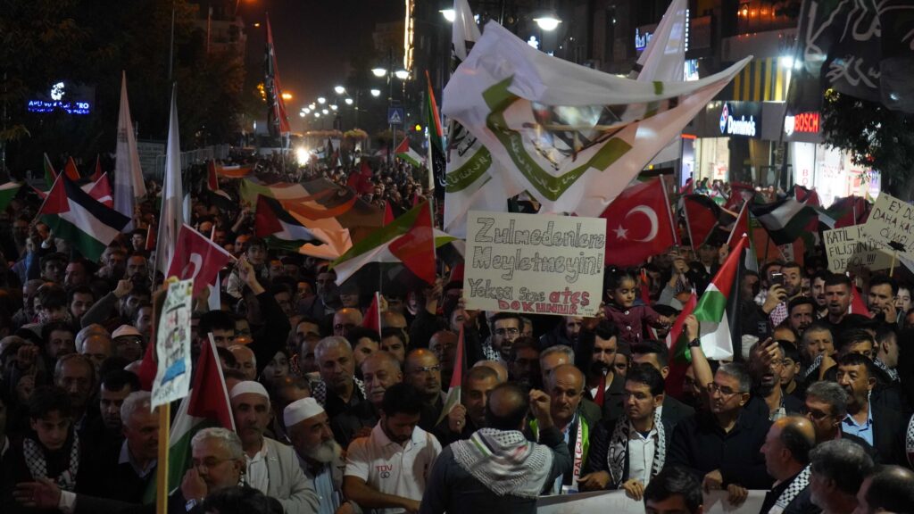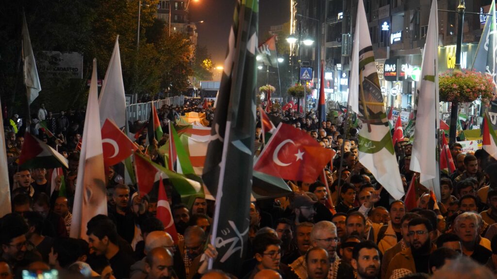 Ellerinde Filistin bayrakları ve dövizlerle yürüyen vatandaşlar, sık sık “Kahrolsun İsrail” ve “Gazze yalnız değildir” sloganları attı. Yürüyüş boyunca Filistin halkına destek mesajları verildi.