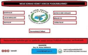 SBÜ Van Eğitim ve Araştırma Hastanesi bazı polikliniklerde mesai sonrası hizmet veriyor. Hastanenin sosyal medya hesapları üzerinden bugün mesai sonrası hizmet verecek olan polikliniklerin isimleri paylaşıldı. Bugün hizmet verecek olan polikliniklerin isimleri şöyle; “Kardiyoloji, Çocuk Nörolojisi, Radyoloji, Beyin ve Sinir Cerrahisi, Nükleer Tıp, Perinatoloji, Dermatoloji (Cildiye)”