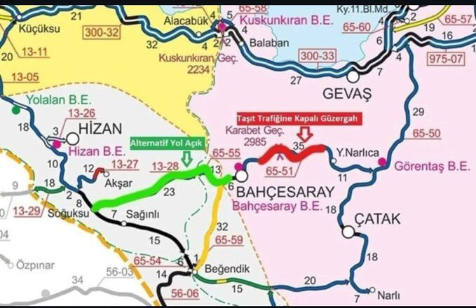 "Vatandaşlarımıza duyurulur! Karayolları ekiplerince, çığ düşmesi nedeniyle 65-51 Bahçesaray( Liman Mevki) -Çatak (Yukarı Narlıca Mah. ) karayolu güzergahı geçici olarak çift yönlü trafiğe kapatılmıştır."