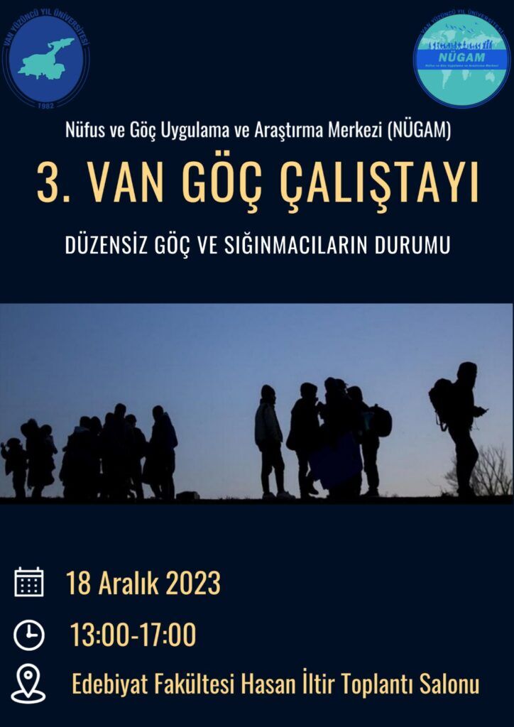 Van YYÜ’den yapılan duyuruda, “3.Van Göç Çalıştayı : Düzensiz Göç ve Sığınmacıların Durumu 18 Aralık 2023 Pazartesi 13.00 - 17.00 Van YYÜ Edebiyat Fakültesi Hasan İltir Toplantı Salonu.” İfadeleri kullanıldı.