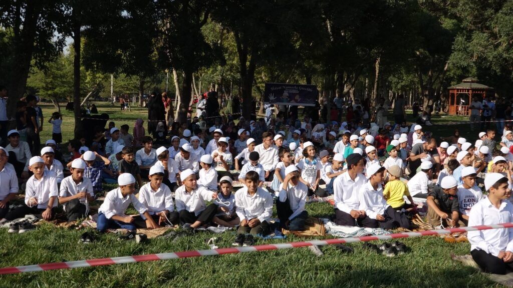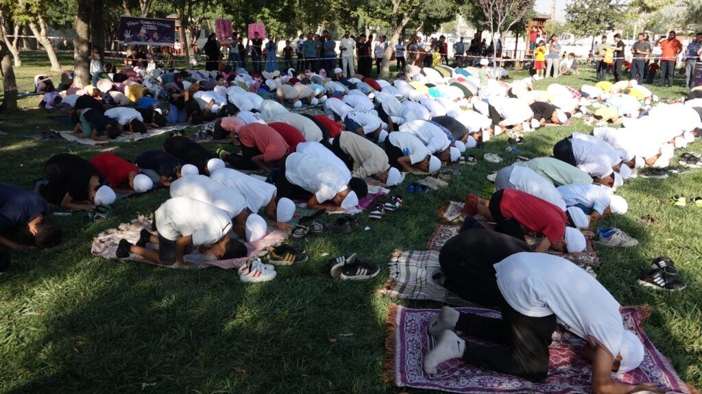 Konuşmanın ardından ezan okundu, yüzlerce çocuk ve aileler omuz omuza saf tutarak cemaatle ikindi namazı kıldı. İmam, müezzin ve cemaatin çocuklardan oluştuğu görüntüler çevredeki vatandaşlar tarafından büyük bir ilgiyle izlendi.