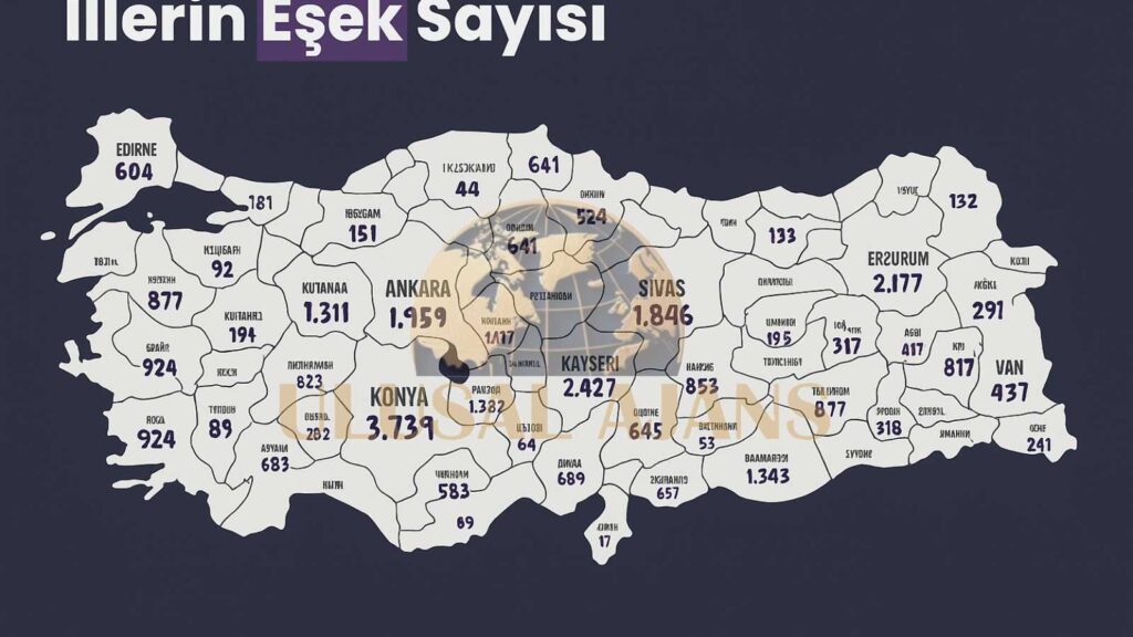 Türkiye genelinde eşek sayısında ilk sırada 3 bin 739 ile Konya yer alırken, bu ili 3 bin 533 eşek ile Elazığ, 3 bin 317 eşek ile Mardin, 2 bin 843 eşek ile Iğdır ve 2 bin 837 eşek ile Aydın izledi.