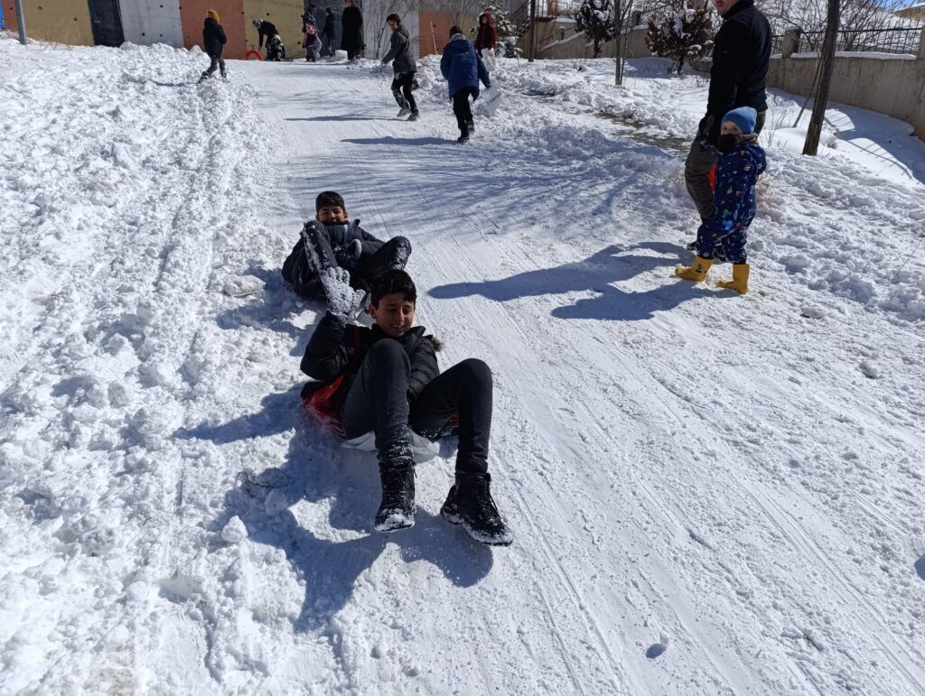 Van’ın Edremit ilçesinde soğuk havaya rağmen sokaklara akın eden çocuklar, bembeyaz örtüyle kaplanan yollarda doyasıya eğlendi.