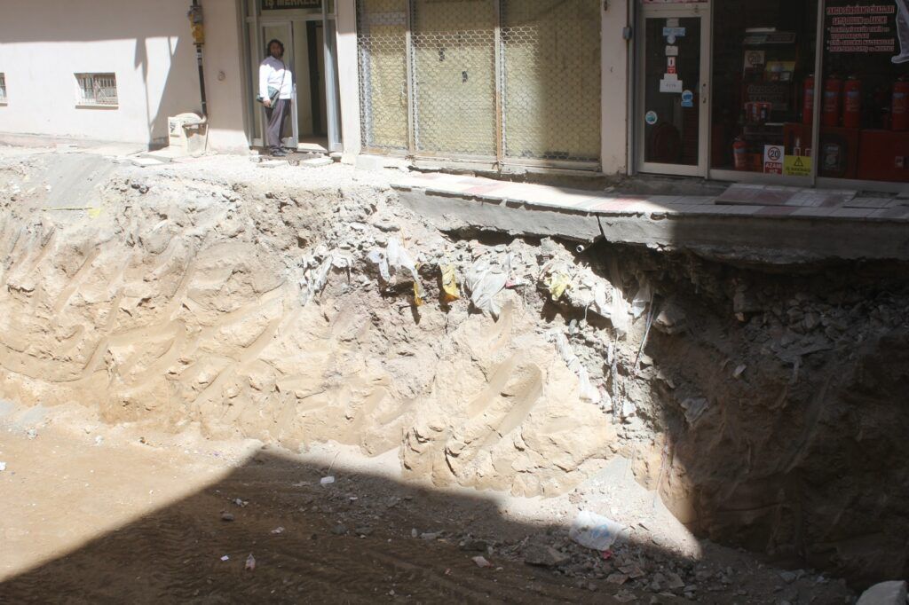 Mühendisler iş merkezi önünde yapılan kazı, iş merkezinde çalışanları da tedirgin ediyor. Derin çatlakların oluştuğu beton geçidin altı da günden güne boşalıyor. Geçitten çok dikkatli geçmeye çalışan vatandaşlar yetkilileri göreve çağırdı.