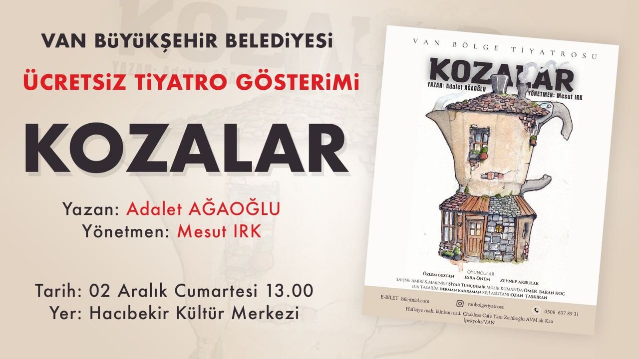 Her hafta bir birinden güzel etkinlikleri Vanlılar ile buluşturan Kültür ve Sosyal İşler Dairesi Başkanlığı 2 Aralık Cumartesi günü saat 13:00’da Hacıbekir Kültür Merkezinde Türk edebiyatının en önemli romancılarından biri olan Adalet Ağaoğlu’nun yazdığı Mesut Irk’ın yönetmenliğini yaptığı ‘Kozalar’ tiyatro oyunu sergilenecek.