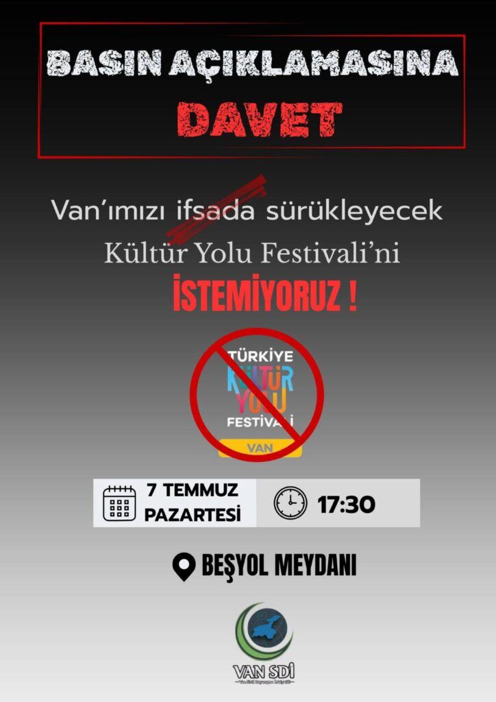 Yapılan duyuruya göre, basın açıklaması 7 Temmuz Pazartesi (Bugün) saat 17.30’da Beşyol Meydanı’nda yapılacak. Hazırlanan görselde “Van’ımızı ifsada sürükleyecek Kültür Yolu Festivali’ni istemiyoruz” ifadeleri yer alırken, festival logosu üzerine kırmızı yasak işareti konuldu.